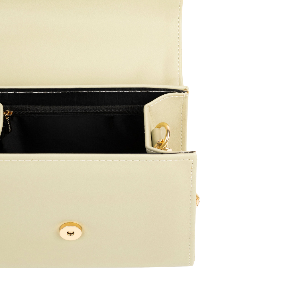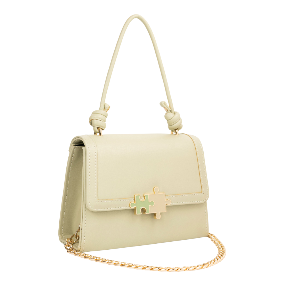 This classic mint handbag is made from rexine material and designed for everyday use. It features a magnetic puzzle lock detail, a single open compartment, and a mini inside zip pocket for basic organization. A knotted rexine handle adds a refined look, while the golden metal shoulder chain offers an additional carrying option.